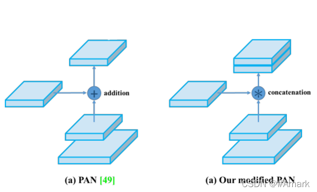 YOLOv4对于原本的PAN又进行了修改,改变了原本的最终多层的特征融合方式,由数值的相加改为了维度的链接。使得多层的信息更好的融合保存下来。其如图 4所示