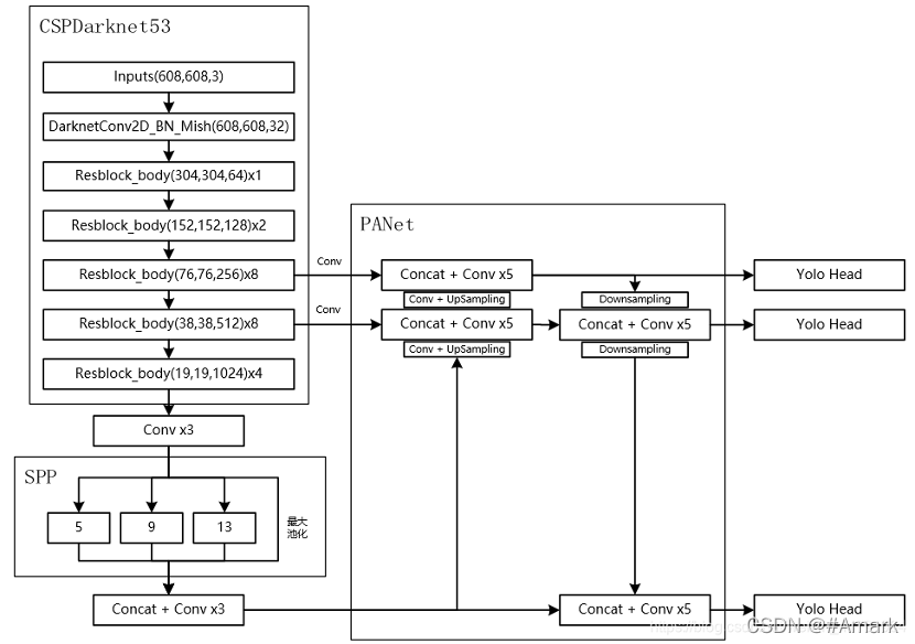 如图所示,YOLOv4的网络大致可以分为CSPDarknet53,SPP,PANet,和最终输出结果的YoLo Head四个部分组成。可以看到YOLOv4的最终输出是由三个YoLo Head的输出组成,它们分别在网络结构的不同地方采样,采样倍数分别为,8倍,16倍,32倍。靠前的采样感受野较小,更加倾向于检测小目标,靠后的采样感受野大,能更好的检测大目标。三者的联合便使得此算法对各种大小的目标都能很好的进行检测。