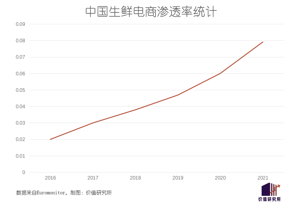 数据显示,目前中国生鲜零售市场规模超过5万亿元,线上渠道占比约为15%,这个过去几年一直在提升。除此之外,生鲜电商的渗透率也保持稳定增长。客观地说,疫情为生鲜电商提供了新的活力。来自Euromonitor的报告就指出,2021年中国生鲜电商渗透率为7.91%,较2016年接近翻了四倍,在疫情爆发后上升势头尤为明显。