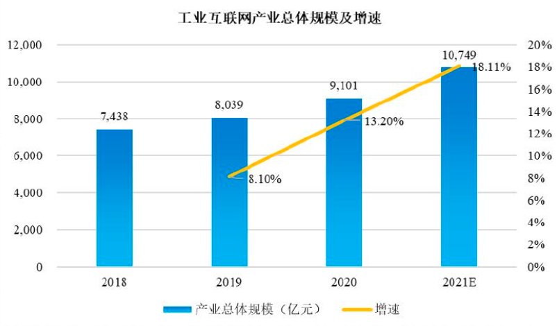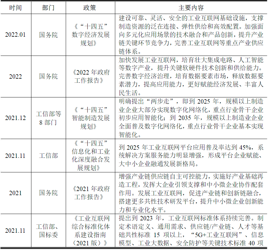 首先是政策的支持。工业互联网作为国家科技创新战略之一,代表着未来制造业发展的方向。从 2018 年首次被写入政府工作报告到 2020 年被确定为新基建重点方向之一,“加快发展工业互联网”一词已连续五年出现在政府工作报告里。2021 年,《“十四五”规划》提出了“在重点行业和区域建设若干国际水准的工业互联网平台和数字化转型促进中心”的要求。在新时期,工业互联网对构建以国内大循环为主体、国内国际双循环相互促进的新发展格局,以及保障产业链、供应链的安全稳定等方面有着重要作用。