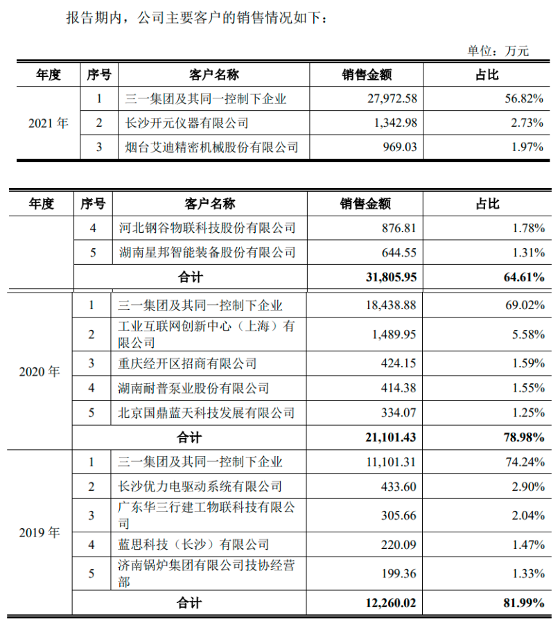 也正因为此,树根互联形成了与三一集团等关联方较大金额的关联交易。2019年-2021年,树根互联向第一大客户三一集团及其同一控制下的企业销售收入合计分别为11101.31万元、18438.88万元和27972.58万元,占各期营业收入的比例分别为74.24%、69.02%和56.82%。