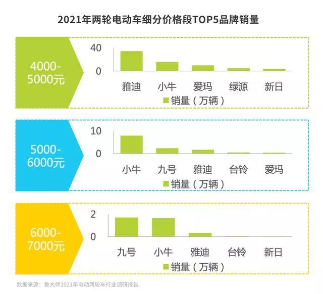 从数据来看,2021年雅迪仅在4000-5000元价格段的两轮电动车领域销量排名第一,在5000-6000元、6000-7000元的价格段均排名第三,落后于小牛和九号。