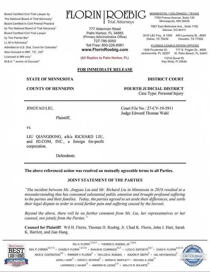 刘强东先生和刘婧尧女士于2018年在美国明尼苏达的一次偶然事件所造成的误会,占用了大量的社会资源,也给彼此的家庭造成了深重的困扰。今天,为了避免进一步的诉讼伤害,双方决定消除误会,达成和解,为这次事件画上句号。除以上声明,刘婧尧女士及其代表和律师不再发表任何评论,双方也不会出具其它的联合声明。