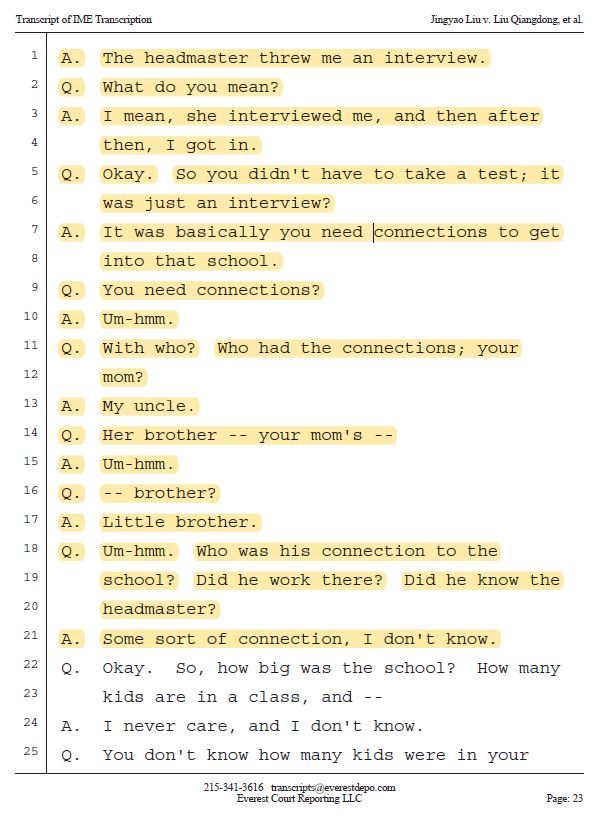 按照刘的说法,自己能够上这所北京顶级学校,是依靠舅舅和校长的关系,“进入这所学校并没有经过考试,只是经过了一个面试”。同时,舅舅还解决了全家人的北京户口。