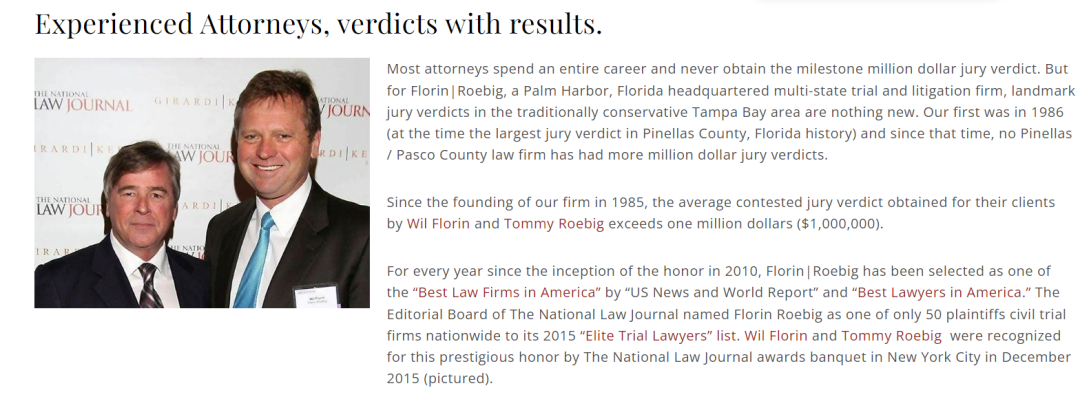 根据Florin|Roebig律所网站披露的信息显示,自1985年成立以来,Wil Florin和Tommy Roebig为其客户获得的平均的陪审团裁决都超过一百万美元。