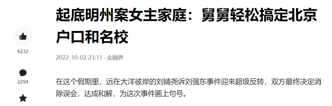 “金融界”一篇名为《起底明州案女主家庭:舅舅轻松搞定北京户口和名校》的文章,在网上获得了近万网友的留言,其中在今日头条上就有几千条留言。