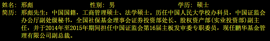 大智慧数据中心的资料显示,邢彪现任鹏华基金管理有限公司副总裁。在“鹏华动力增长混合”基金的介绍中,公开了邢彪的履历——中国人民大学校办科员出身,随后在中国证监会和全国社保基金担任要职,并且有过两年证监会主板发审委的专职委员的经历,此后入职鹏华基金公司。