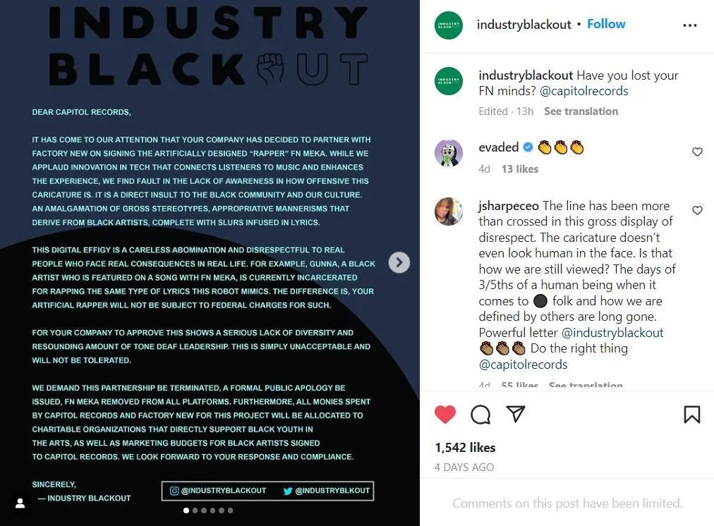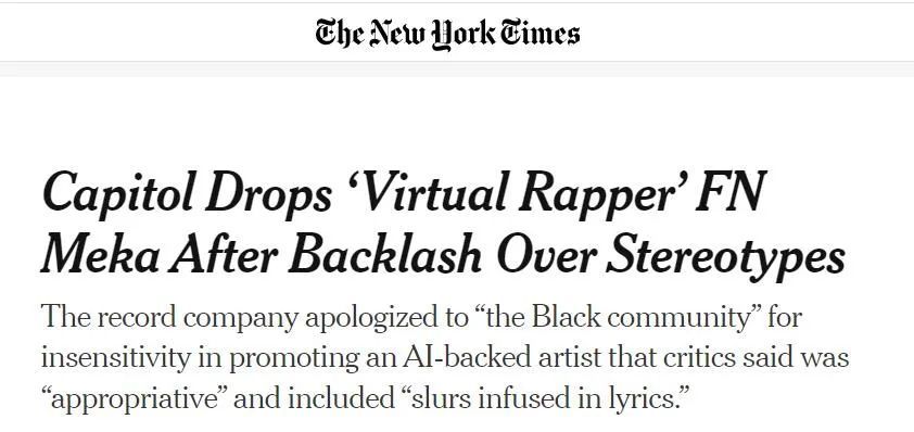 8月23日,在黑人权益激进组织Industry Blackout指控虚拟rapper FN Meka及其作品存在不恰当的文化挪用、强化黑人群体的刻板印象后,环球音乐旗下唱片公司Capitol Records(国会唱片)选择与虚拟Rapper FN Meka正式解约。
