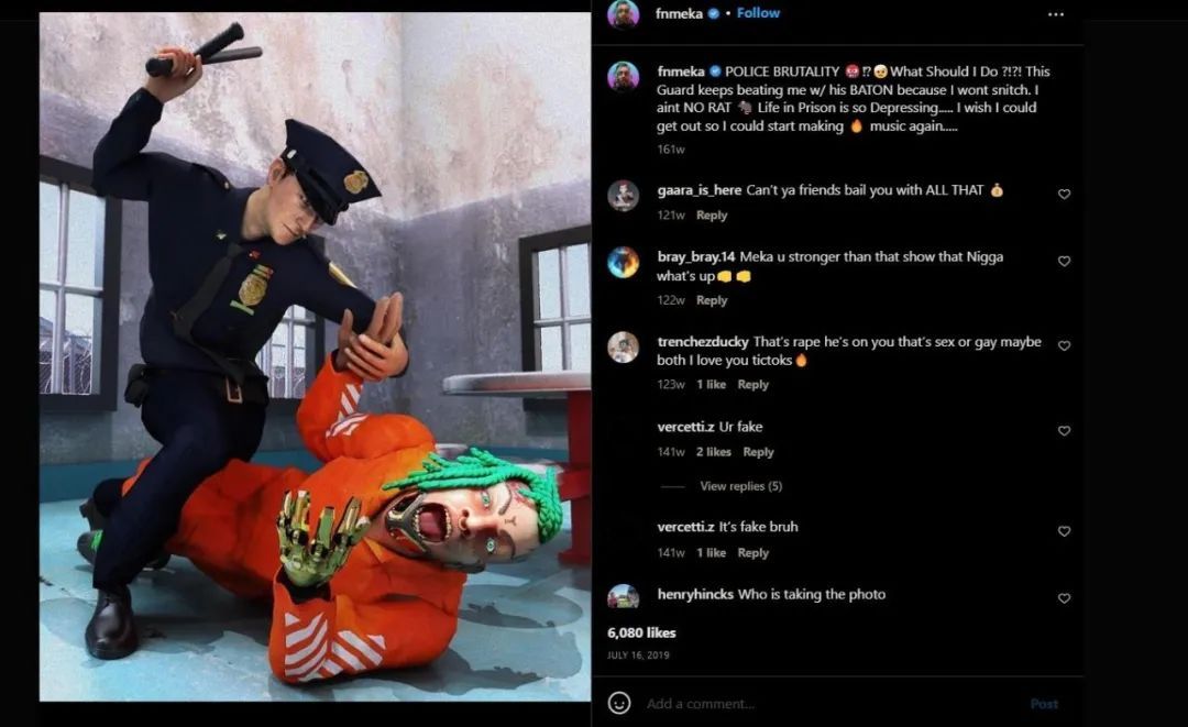 8月23日,Twitter用户公布了一张FN Meka 在2019年6月发布的ins页面截图,在照片中FN Meka被一名白人警察殴打,直指他轻视了警察的暴行,同样引发了大量的舆论关注。