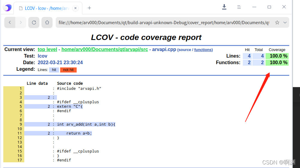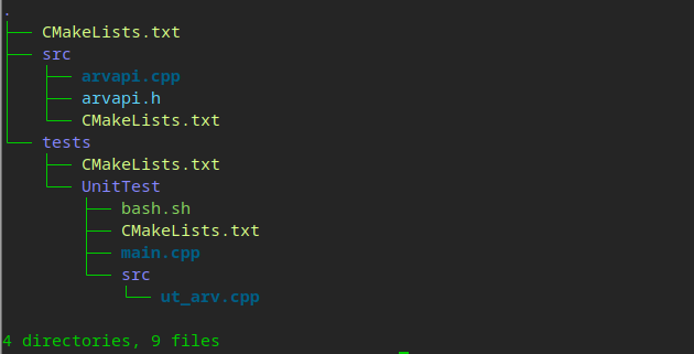 类型 文件说明文件./CMakeLists.txt整体项目工程文件目录./debiandeb包打包脚本目录,未实现目录./rpmrpm打包目录,rpm打包的详细内容可以看链接目录./src源码目录,所有的源码都放在该目录下。文件./src/arvapi.h动态链接库的头文件。 文件./src/arvapi.cpp动态链接库的源文件。文件./src/CMakeLists.txt 动态链接库的g工程文件目录./tests所有的测试文件都放入这个目录中文件./tests/CMakeLists.txt测试工程文件,其中有可能包含模糊测试等。目录./tests/UnitTest单元测试目录目录./tests/UnitTest/src与源程序对应的目录文件./tests/UnitTest/src/CMakeLists.txt单元测试项目文件文件./tests/UnitTest/main.cpp单元测试主程序文件./tests/UnitTest/src/ut_arvapi.cpp