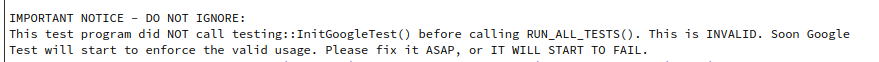 This test program did NOT call testing::InitGoogleTest() before calling RUN_ALL_TESTS(). This is INVALID. Soon Google Test will start to enforce the valid usage. Please fix it ASAP, or IT WILL START TO FAIL.