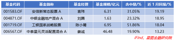 首先,因为未来国家政策、战略主要围绕中字头、央企国企,所以我们在筛选基金的时候将这两类股票的持仓在基金净值中的占比作为重要的指标,也即“含中量”必须要高,这是最重要的条件(30%以上,基金池最高占比在50%左右);其次中国特色估值体系是在11月21日提出,但是必定会在前期发酵,所以我们选取11月21日前后各半个月的基金业绩作为另一重要的筛选维度,即选取的时间段为截至12月5日近1个月,如果在这1个月内基金的回报保持一个比较好的水准(涨幅≥0%),那么也可以从侧面证明基金经理的能力;最后我们主要聚焦主动权益型基金、同一位基金经理保留1只产品、剔除C类份额以及从基金的规模、经理背景、持仓、波动回撤数据等出发进一步筛选。最终得出以下4只基金: