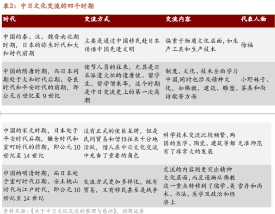像是在秦汉、南北纬时期,日本正处于弥生时代和大和时代前期,徐福远赴日本,传播中国物质文化、生产技术和生产工具,促进文化交流。后来,在隋唐时代、宋元时代和明清时代,以小野妹子、鉴真和尚、无准师范、雪舟和尚为代表的僧侣,在中日文化交流中,充当了重要角色。