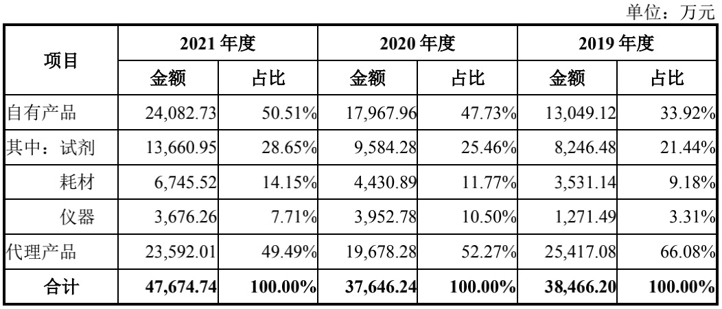 离职创业,张其胜等三人选择了老本行体外诊断行业,一开始主要代理国际、国内体外诊断品牌的部分产品,后来才逐步自主研发、生产和销售自有产品。2019年-2021年,沃文特自有产品收入分别为1.30亿元、1.80亿元、2.41亿元,占主营业务收入的比重分别为33.92%、47.73% 和 50.51%。