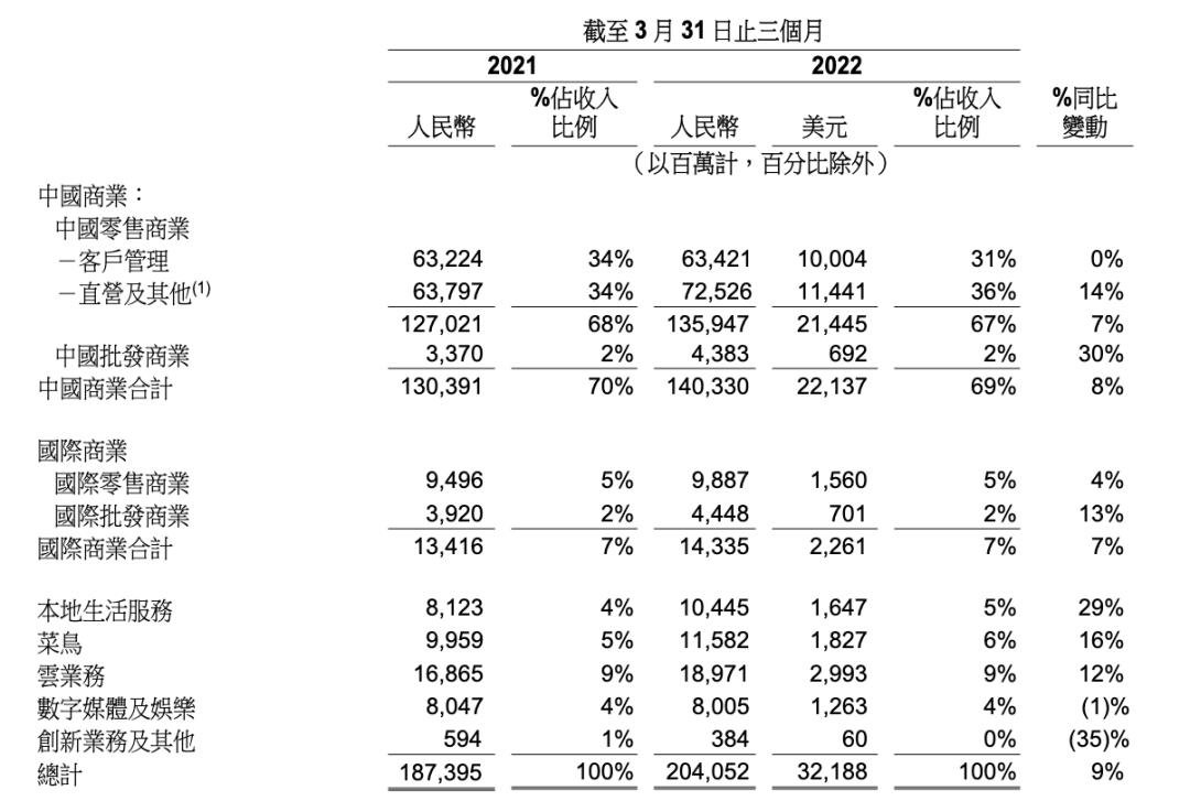一季度,中国商业分部 EBITA (税息折旧及摊销前利润)由去年同期的395亿元,下降到321.49亿元。导致 EBITA 同比下降19%的原因,主要是公司对淘菜菜和淘特投入增加,以及疫情持续影响、高鑫零售资产减值损失。