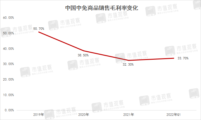 招股书显示,2019年-2021年及2022年Q1,中国中免的商品销售毛利率从50.7%降至33.7%。