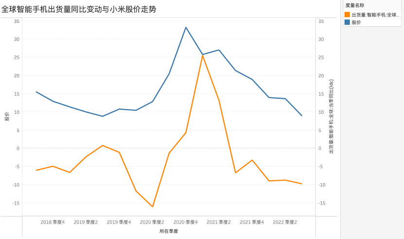 尽管小米业务分布广泛,但其最重要标签仍是“智能手机”,由于企业业务布局广泛(海外市场占营收比已在50%上下),因此我们分别将全球和中国智能手机出货量的同比变动情况与当期小米股价进行对比,见下图