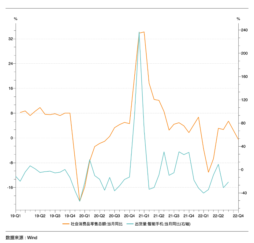 从2019年至今,我国社零走势大致上与智能手机保持走势的一致性,我们本希望可以从中找到两者的前置或滞后因素,但并未找到,两条折现几乎保持同频节奏。