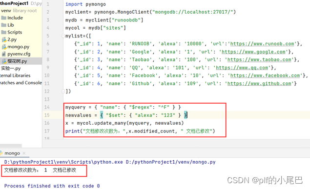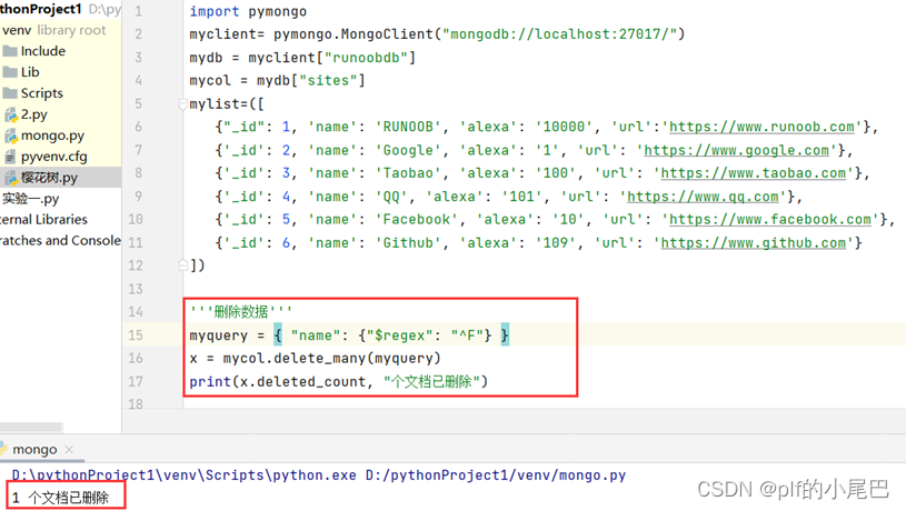 delete_one() 方法来删除一个文档,该方法第一个参数为查询对象,指定要删除哪些数据。