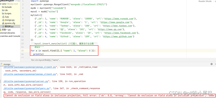 1、mydb = client["runoobdb"] mydb(相当于别名吧)=client[“数据库名称”]