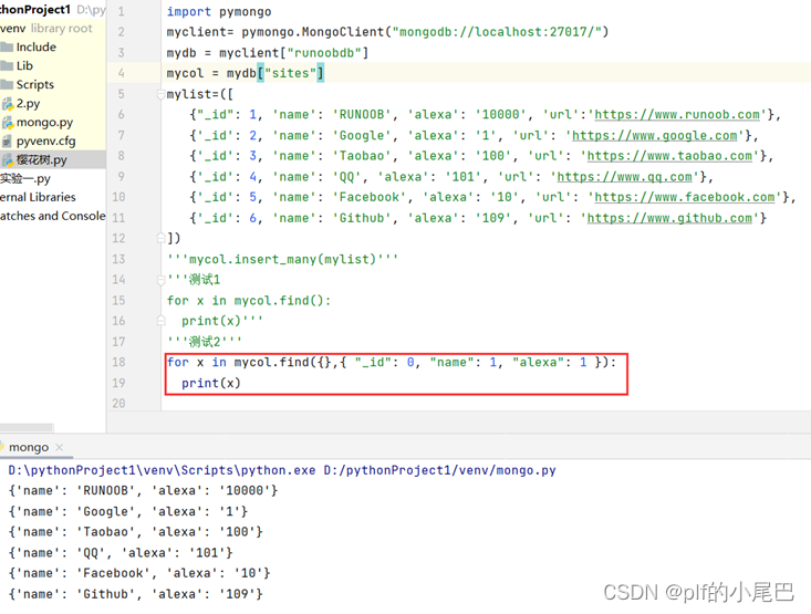 for x in mycol.find({},{ "_id": 0, "name": 1, "alexa": 1 }):