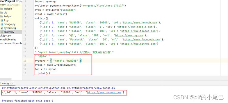示例4、查询姓名为RUNOOB的,将查询存储到myquery里面,将结果存储到mydoc里面