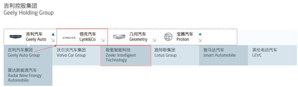 但是在吉利的官网上,极氪品牌的运营公司比领克品牌的运营公司,在级别上还要高一个级别:领克是隶属于吉利汽车集团,极氪隶属于极氪智能科技,吉利汽车集团与极氪智能科技同属于吉利控股集团乘用车业务板块。