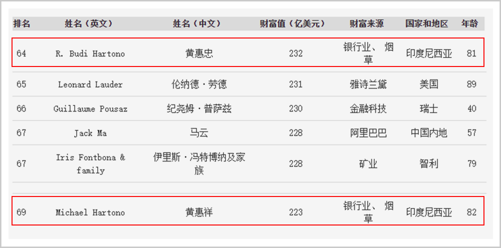 2022年12月,福布斯印尼富豪榜出炉,黄辉祥和黄辉聪兄弟依旧位列榜首。这个位置他们连坐了14年。