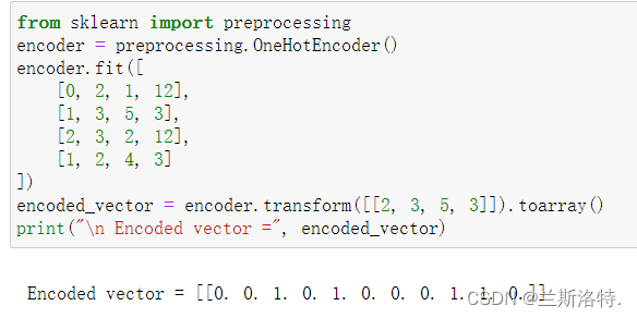 则第一个特征为[0,1,2,1],其中去掉重复的,即有三类特征值[0,1,2],因此独热编码可以将[0,1,2]表示为[100,010,001]。拿其中一个具体来说,如果样本中在第一个特征中取的是2这个特征值,那么2在特征值的第三个位置上则第三个位置为1,其他特征的位置为0,所以特征值2经过独热编码后的结果为[0,0,1]。