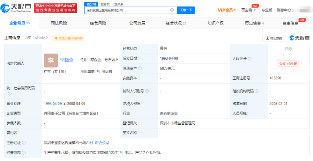 天眼查显示,深圳奥美卫生用品有限公司注册资本58万美元,生产经营手术垫、腹部垫及其它医用敷料和医疗卫生用品,且产品70%用于外销,股东包括香港奥美实业公司及湖北省仙桃市卫生材料厂。不过,该公司早已处于吊销营业执照状态,变更记录也停留在了1994年,之后,崔金海几人便又同时来到香港奥美工作。