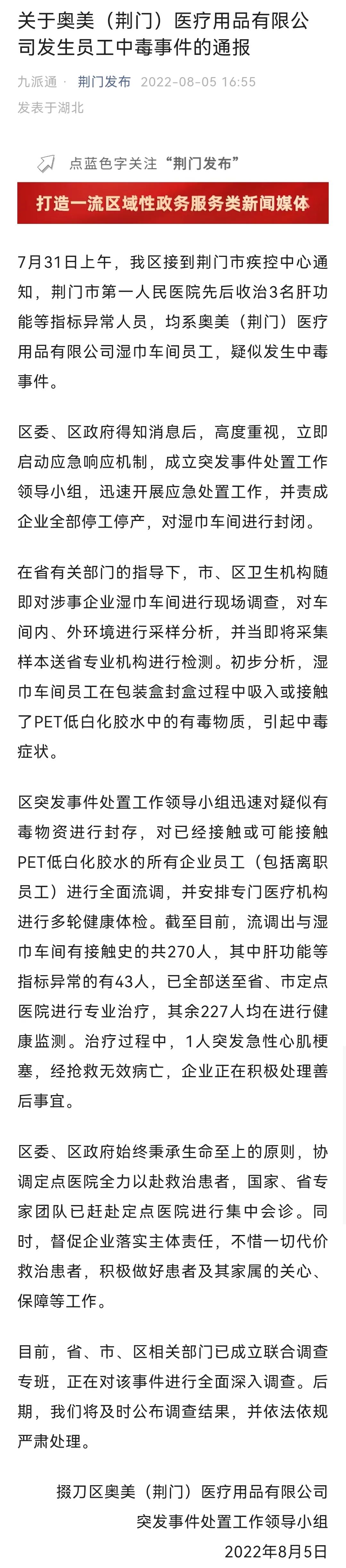根据5日下午最新“荆门发布”官方通报,7月31日上午,荆门区接到荆门市疾控中心通知,荆门市第一人民医院先后收治3名肝功能等指标异常人员,均系奥美(荆门)湿巾车间员工,疑似发生中毒事件。目前已流调出与湿巾车间有接触史的共270人。荆门市卫健委也已介入调查。