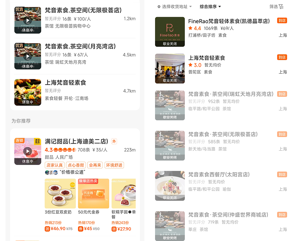 梵音素食店主要开在上海,目前也几乎都已闭店