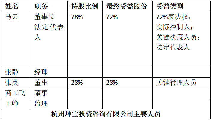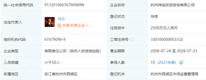 坤宝投资成立于2008年7月24日,经营范围为企业管理咨询、企业管理、社会经济咨询服务。除了马云控股72%,张英控股28%,是马云家族全资掌控的投资企业。成立14年来,都是马云担任法人和董事长。