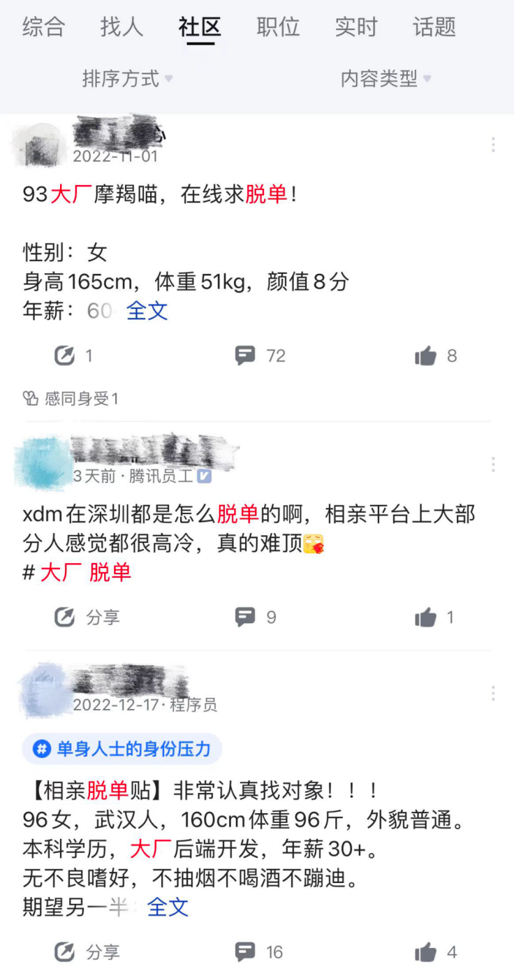 于是,相亲社交平台、公司内网,甚至是脉脉,成为有脱单需求的大厂青年的首选。