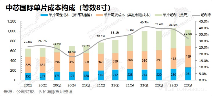 2022 年第四季度中芯国际的毛利率为 32%,环比下降 6.9pct,略超市场一致预期(31.6%)。