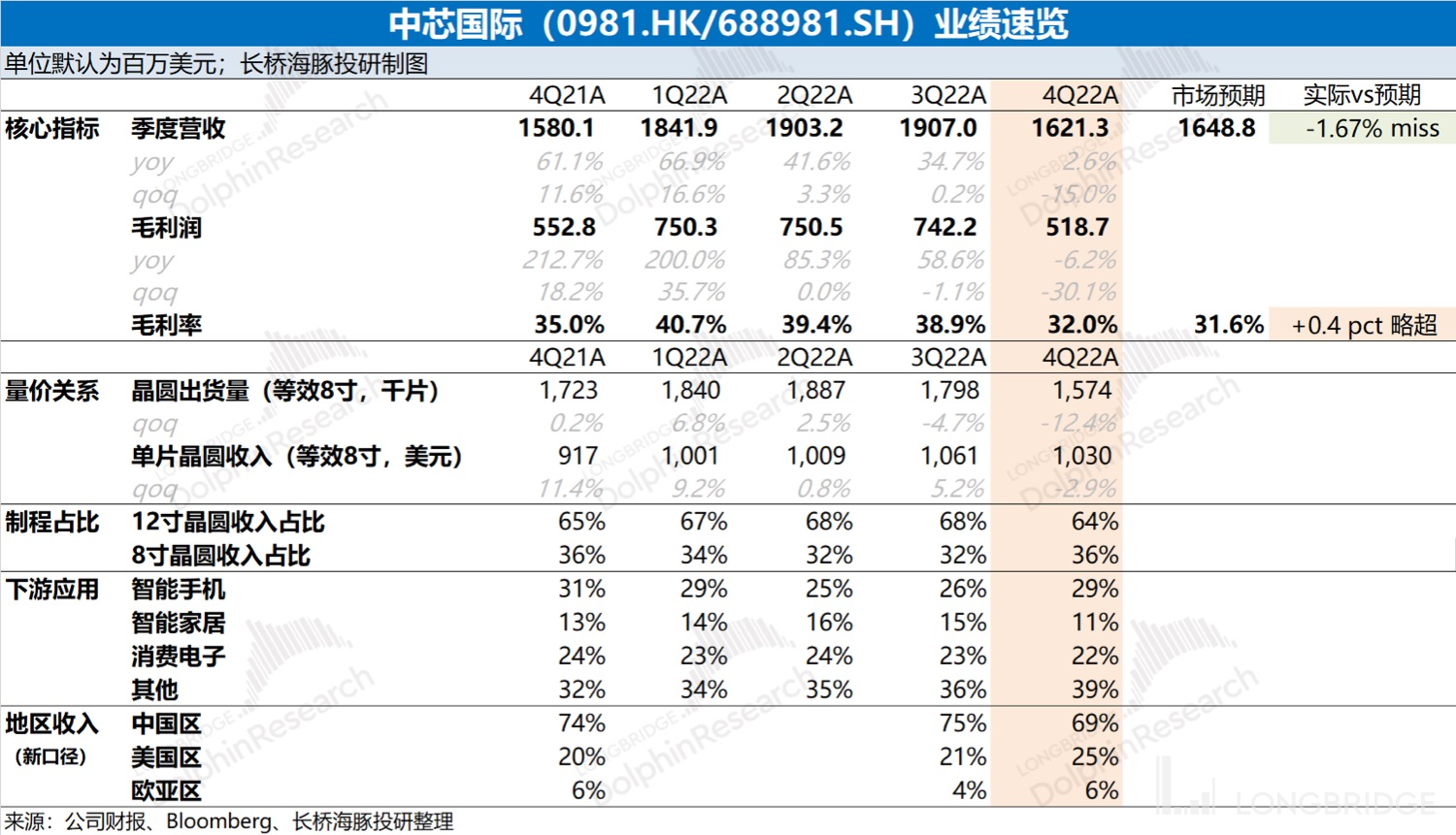 4、下季度指引:中芯国际预期 2023 年第一季度收入环比下滑 10%-12%(对应 14.3-14.6 亿美元),明显低于市场预期(收入 15.24 亿美元);毛利率 19-21%,明显低于市场预期(毛利率 26%)。