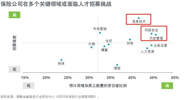 德勤《2022年保险行业展望》显示,保险公司或将在人才、技术层面面临更为严峻的挑战。云计算、数据科学和分析、人工智能和机器学习、软件开发和网络安全也成为保险行业结构优化的所涉领域。