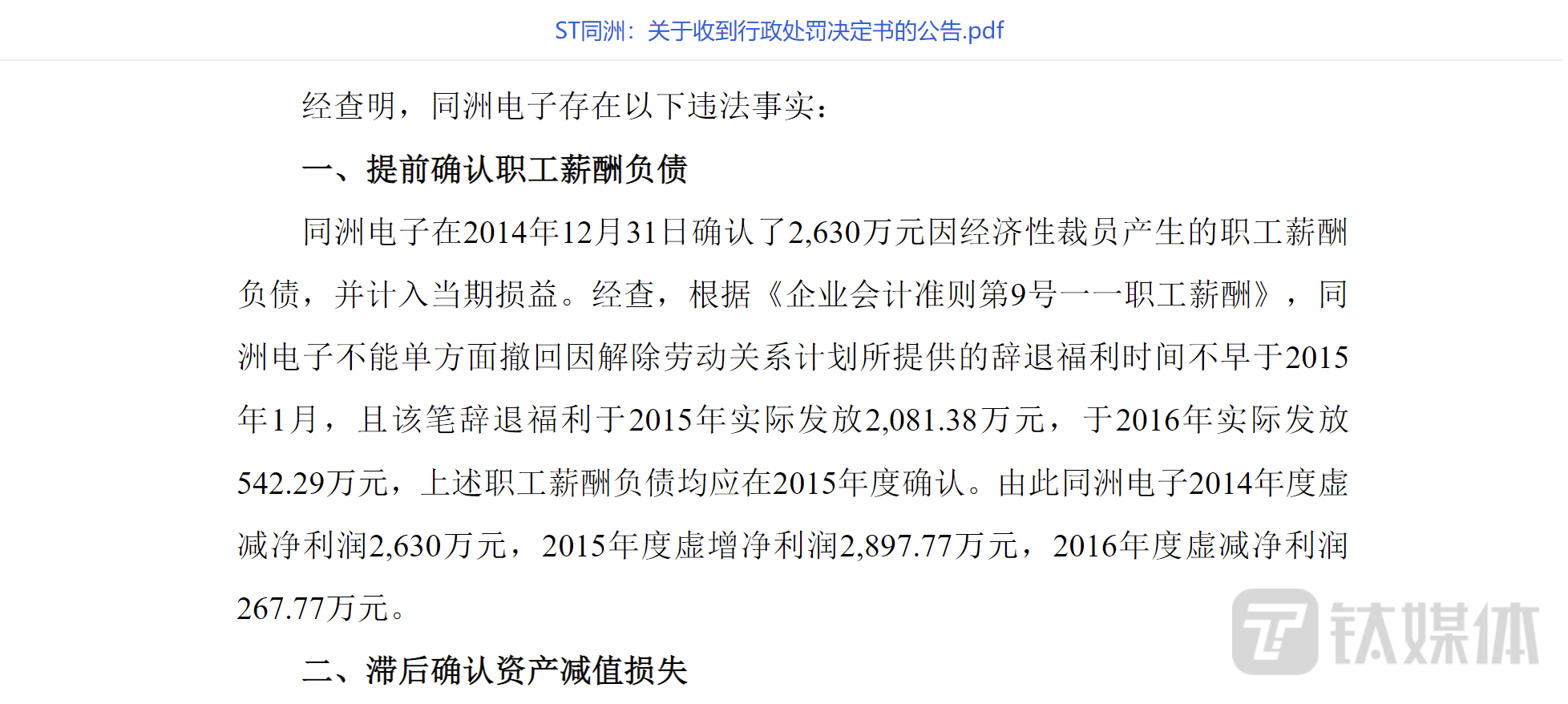2016年,公司虚减净利润4203.44万元,主要就是因为2014年和2015年,*ST同洲的部分职工薪酬负债和2015年度确认资产减值损失所致。