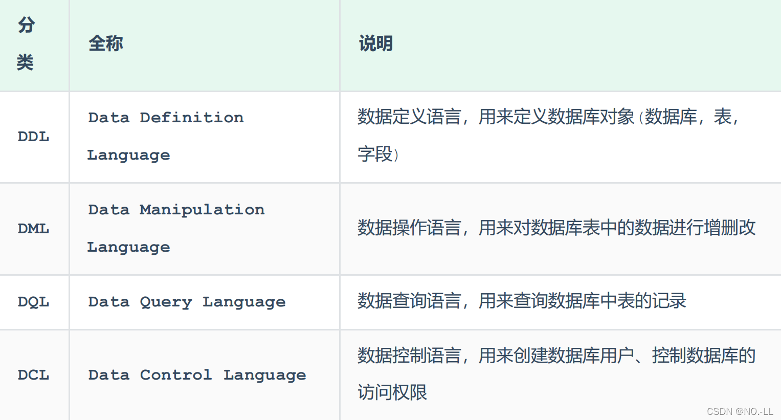 SQL语句,根据其功能,主要分为四类:DDL、DML、DQL、DCL;