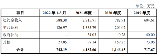 据招股书显示,蜜雪冰城光是加盟费用收入,2019年-2021年以及2022年一季度分别为5996万元、9990万元、1.95亿元和6378万元。2019年-2021年以及2022年一季度违约金收入分别为604万元、782万元、2715万元和588万元。