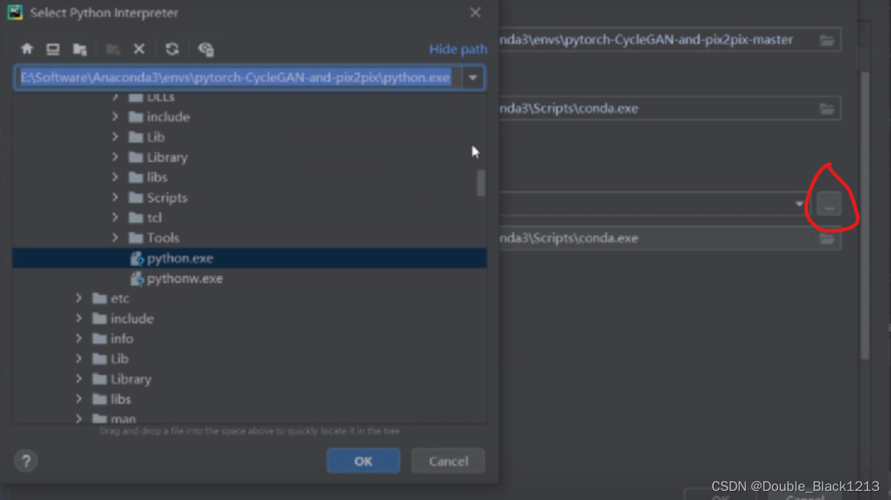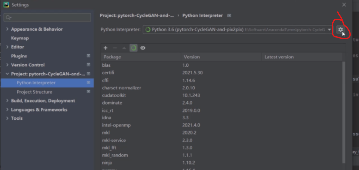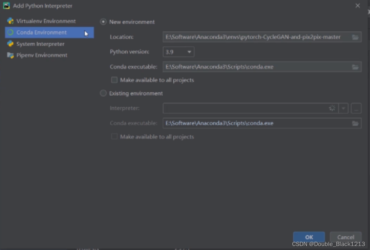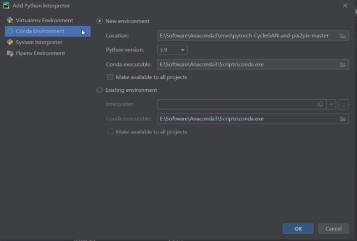 3.找到conda环境(我们是基于conda建立的环境),并点击existing environment