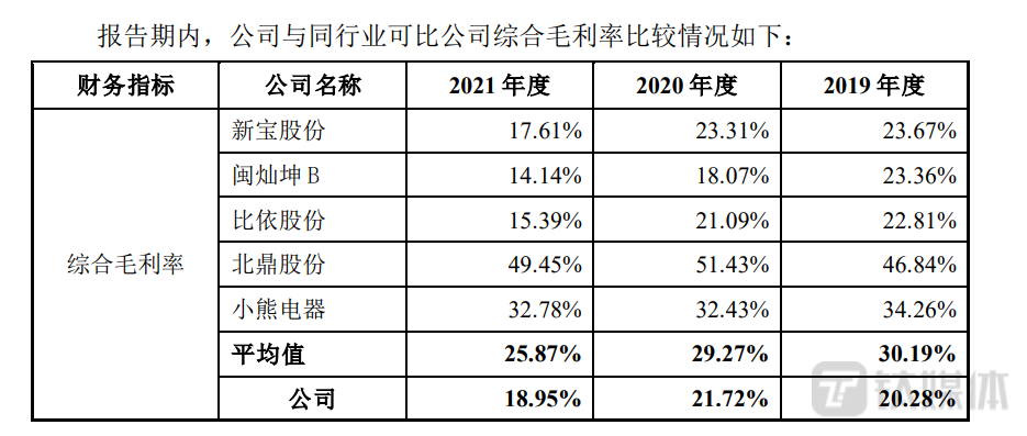 也许正是研发能力不足,公司产品的竞争力不及同行。香江电器的毛利率在近三年来在20%左右上下浮动,最高值达20.28%,发生在2019年,2021年相比前两年小幅下降至18.95%。这个毛利水平低于行业平均值,与毛利率最高的北鼎股份相比,不及对方一半。