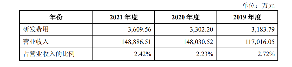 值得注意的是,香江电器的生产模式以ODM/OEM模式为主,近三年来该模式下的收入占营收比重都在90%以上,分别为95.44%、93.81%及93.72%。这也说明了公司主要依靠代工,自主研发、设计的成分较低。这从香江电器近三年来的研发投入及其研发占比便可窥见。