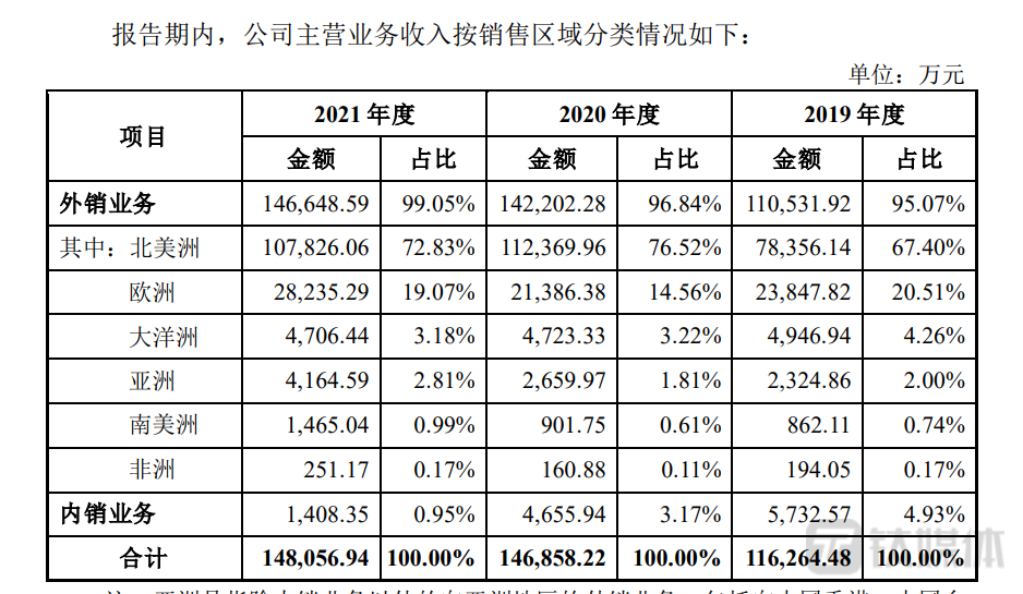 与其他同行小家电公司如小熊电器、北鼎股份等相比,香江电器聚焦于海外。2019年至2021年,公司的外销业务比重都保持在95%以上,尤其是2021年更是高达99.05%。主要集中在北美、欧洲,这两个市场的营收在报告期内销售收入合计占比分别为:87.91%、91.08%和91.90%。由于北美洲、欧洲的主要节日相对集中在下半年,还会导致公司的销售旺季出现在下半年。