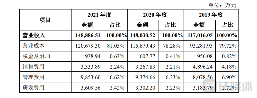2019年至2021年,香江电器营收分别为11.7亿元、14.80亿元及14.89亿元。其中,2020年营收比2019年同比增长了26.5%。这是由于2020年新冠疫情爆发,人们居家时间变长,家居类用品大卖。报告期内,公司净利润分别达3986万元、8913万元及7168万元。营收与净利润的增长趋势大致相同,都在2020年出现较大幅度增长,并在2021年出现增长放缓现象。