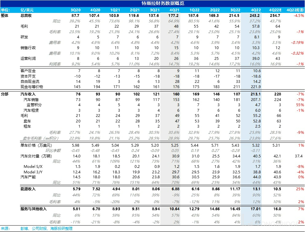 1.1 单价下滑拖累营收。2022 年四季度特斯拉营收 243 亿美元,同比增 37%;收入端看似低于彭博一致预期的 255 亿,但主要是因为市场之前高估了 1.5 多万辆的汽车销量,实际单车价格 5.32 万美元与市场预期基本一致,而汽车销量出来之后,汽车收入体量已基本确认,且股价已经及时反映了销量疲软以及后续降价对毛利率的打压。
