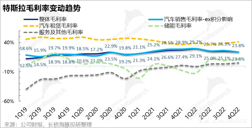 海豚君做粗略估算,在四季度单车 5.32 万的基础上掉价 11% 左右,那么一季度单车均价大约 4.74 万(与特斯拉官方引导的 2023 年单车均价 4.7 万基本吻合),假如单车折旧和可变成本保持不变,那么特斯拉的毛利率就会快速掉到 16% 左右,而比亚迪去年三季度的毛利率也已接近这个水平。