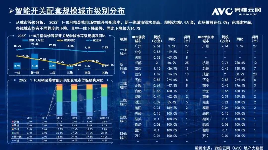 在城市结构方面,成都、南京、西安等新一线城市发展速度更快,对智能开关的需求反而是最高的,规模达到9.4万套,市场份额为43%。其他各线城市的增长速度则出现不同程度的下降,北上广深等一线城市下降最慢,但也同比降低了14.7%。由此可见,智能开关未来的主要发展市场,应该会集中在新一线城市以及周边的二三线城市,一线城市虽然经济发达,但潜力确实在下降。随着明年国内经济复苏,智能开关市场应该会迎来比较大的一波增幅。