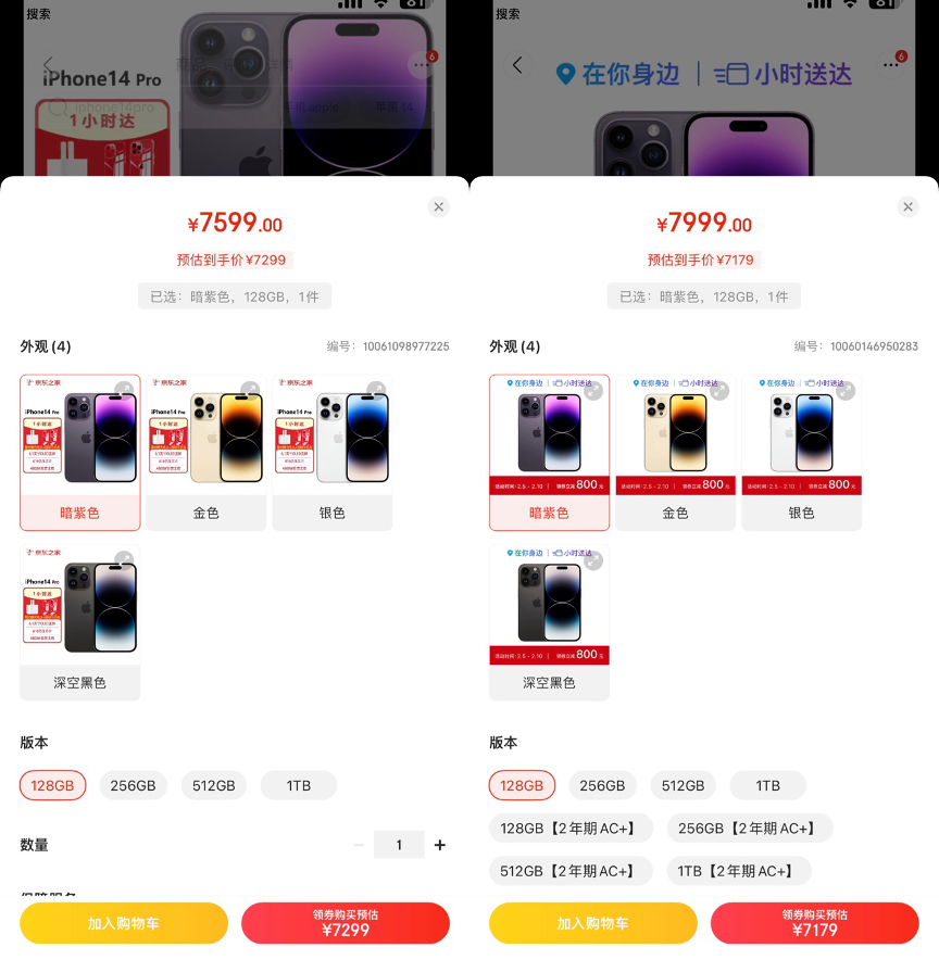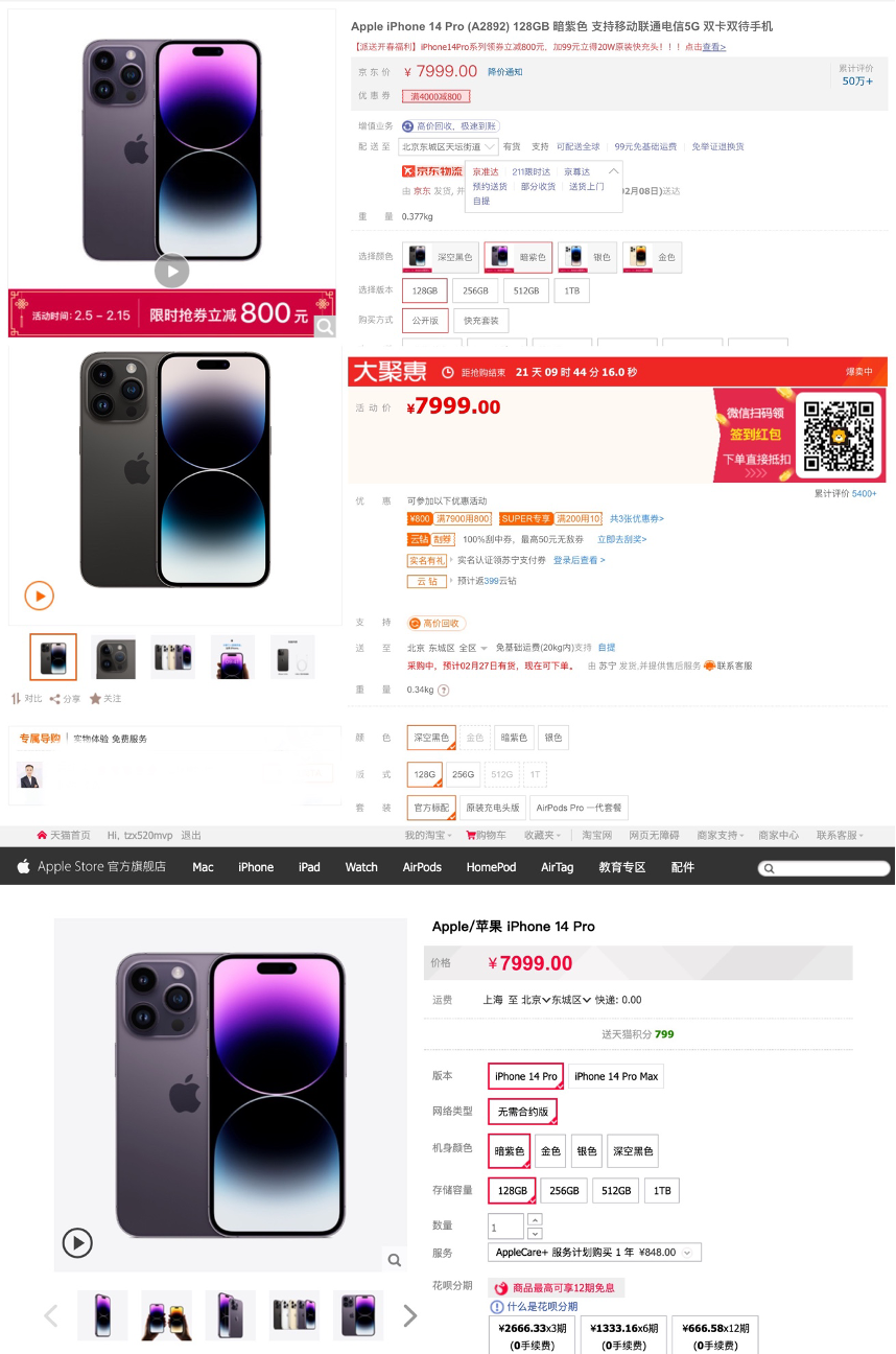 以iPhone 14 Pro机型为例,在Apple Store官网上,起售价为7999元,而电商平台京东上,iPhone 14 Pro起售价虽然还是7999元,但是平台赠送了800元的优惠券,因此起售价到达了7199元。