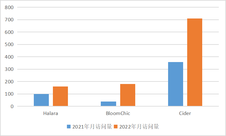 其次,女装市场庞大而且分散,没有很强的差异化或是竞争壁垒的品牌长期来看没有太多的增长空间。其实从品牌官网的月访问量数据来看,Halara、BloomChic、Cider 与 2021 年同期都有较大的提升,甚至 Cider 的品牌官网月访问量从 2021 年 12 月 400 万次左右上升至 2022 年 11 月份的 710 万次,但是在 2022 年资本还是选择了 BloomChic,一方面是因为品牌本身展现出了很强的增长势头,另一方面也与 BloomChic 最初“大码女装”的差异化定位在一众快时尚品牌中另辟蹊径有关。
